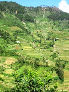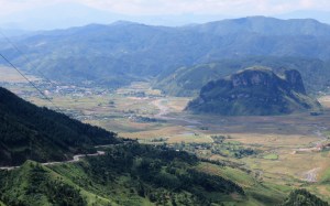 Looking down on a fairly wide valley that included several small villages and towns, as well as vast areas of rice paddies. On the other side of the valley mountains rose skywards.