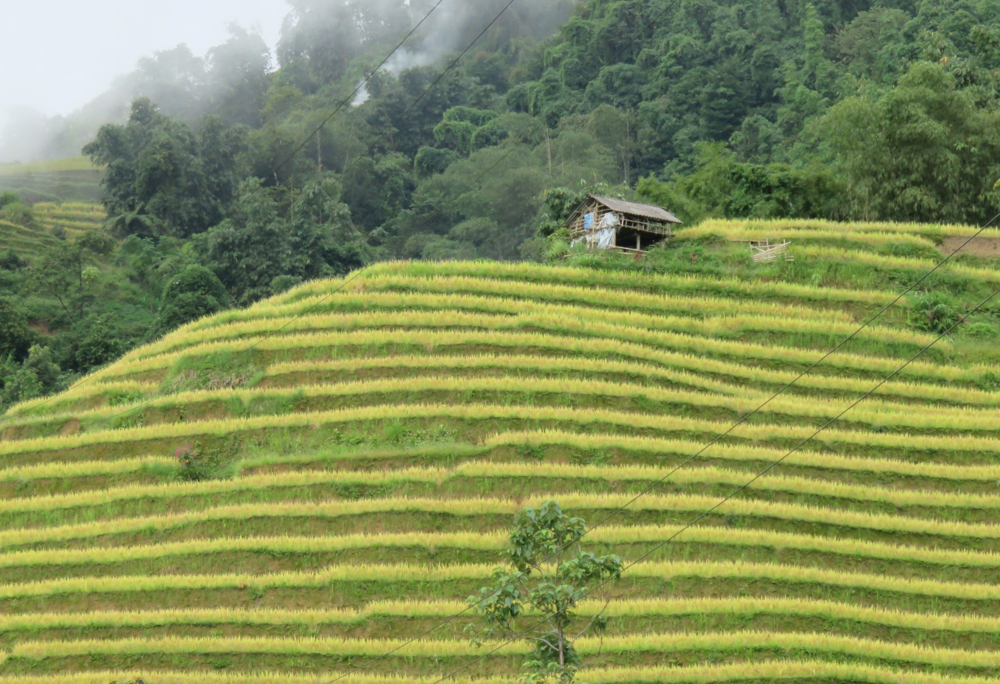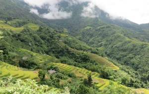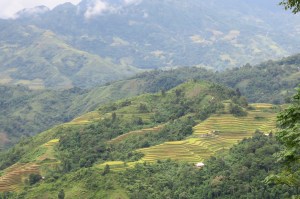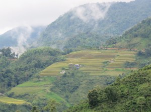 Part way up a mountain, looking down over a valley, with more mountains rising in the distance. Rice terraces everywhere, with farmhouses dotted throughout.