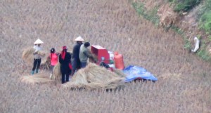 The guy in his rice field using a petrol trimmer to effortlessly harvest his rice, while not two minutes further down the road, there’s a group of six doing exactly the same thing, except they’re bent over doing it by hand.