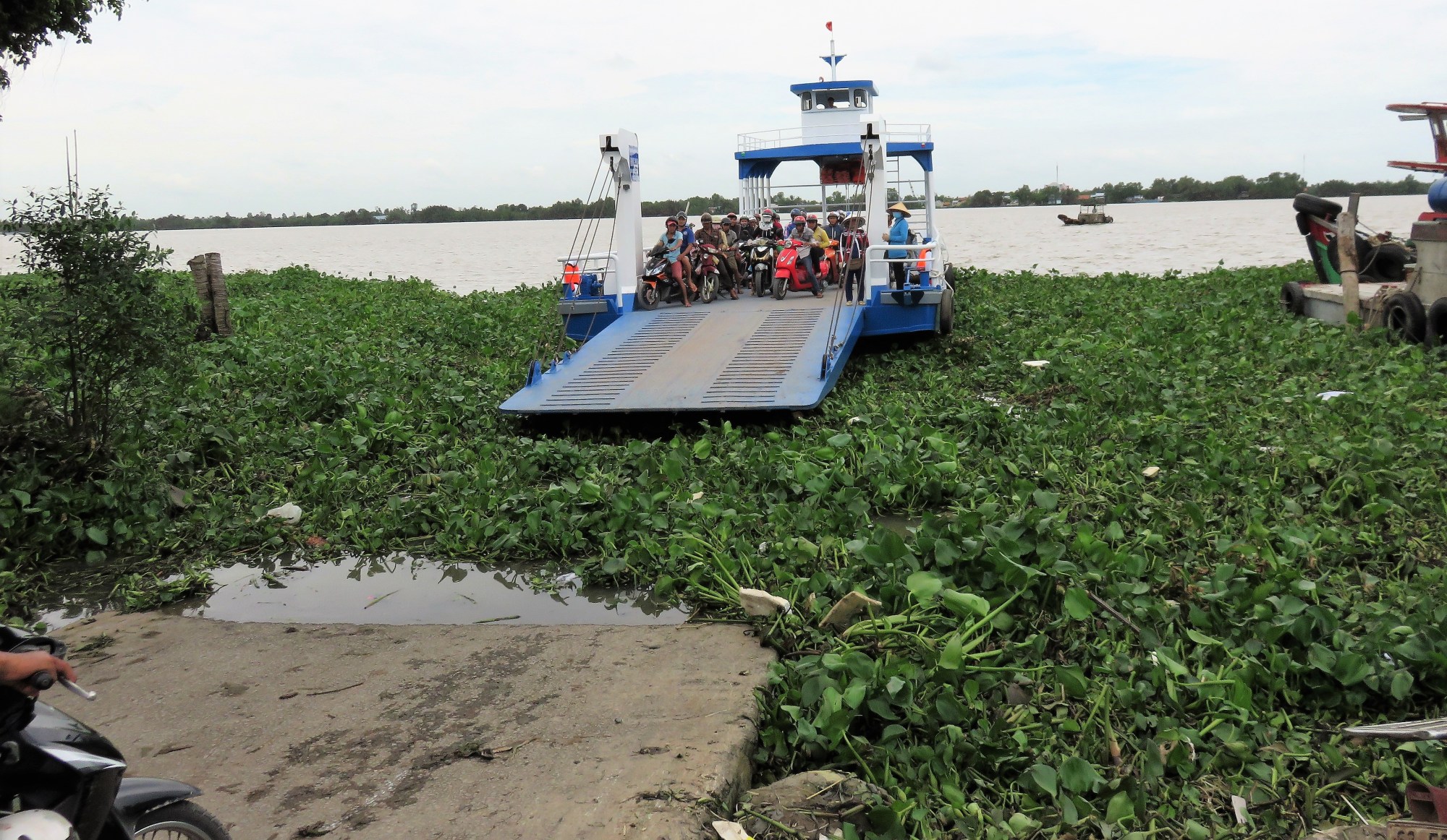 Off the ferry a few minutes later; 4000 Dong per bike, plus 2000 Dong extra for a pillion passenger; and we’re well and truly in rural farmland.