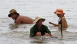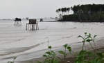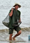 Murky brown / grey water, obviously due to being in the vicinity of countless Mekong tributaries, Vietnamese fishing boats, stilt house like structures actually in the water, as well as locals foraging for shellfish.