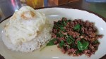 She asks the young coffee guy, but English isn’t his thing. He does however get one of the girls to come over who explains it’s rice, egg, and a choice of chicken or pork.