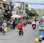 It soon gets much busier, as well as far more built up, and then, in the distance, the Vin Pearl building in Can Tho comes into view.