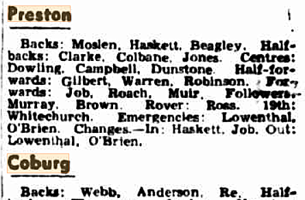 Not listed on the above VFA Project link as playing, but as found on Trove, is listed as the 19th man, in the team published in The Sun News Pictorial on Friday 10 June, 1938 –