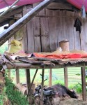 With not too much around in relation to natural shelter, Hung makes use of a covered area of a local’s stilt house.  There’s no one home, but even there was, I doubt that us strangers dropping in unannounced would be a problem.  We wait it out next to some drying rice on a tarpaulin, which, with it being a small stilt house, is above the water buffalo resting below.  It’s all just so surreal, and it’s not a bad way to spend a few wet minutes.