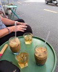 He returns a few minutes later, and once again, we have our caphe sua da’s, along of course with our tra da’s, and we’re sitting in the same spot we were, one day short of exactly four weeks ago.