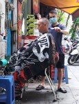 Onto Hang Dieu, and then to the barber, and his only customer is the one he’s currently shearing.
