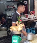 We take a seat in the laneway, and our girl gives us an acknowledging smile. No actual ordering is required; she knows exactly what we want; and a few minutes later, we have our pork skewer bánh mì’s (40 000 Dong).